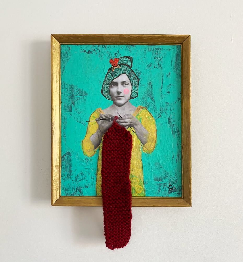 • Medium: paper collage, acrylic, drawing, and acrylic fiber on canvas, set in an antique frame