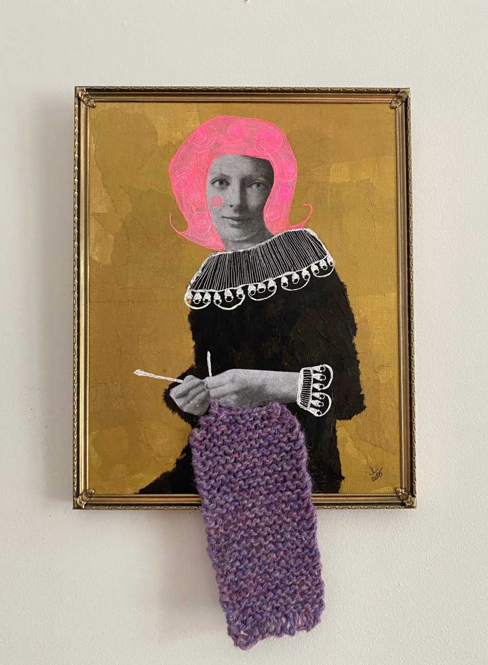 • Medium: paper collage, acrylic, drawing, and wool on canvas, set in an antique metal frame