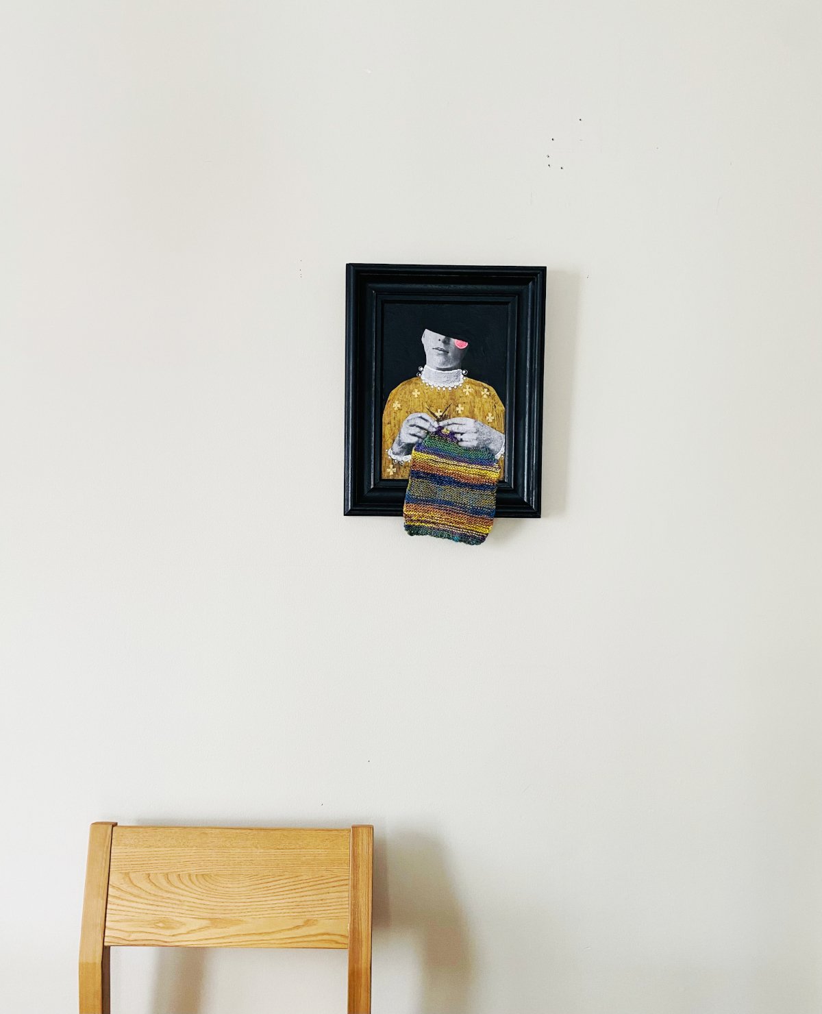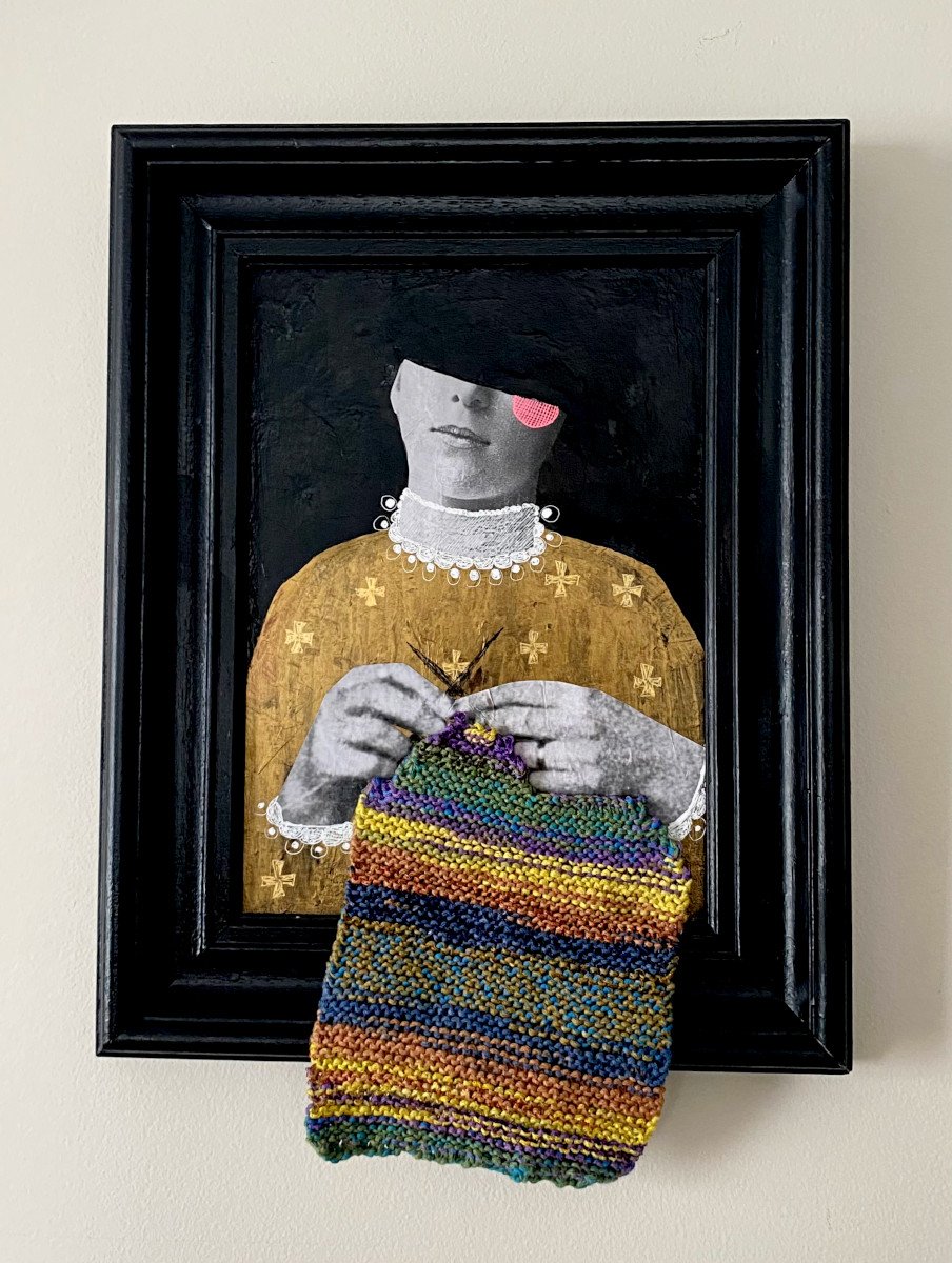 • Medium: paper collage, acrylic, drawing, and acrylic fiber on glass, set in an antique restored frame