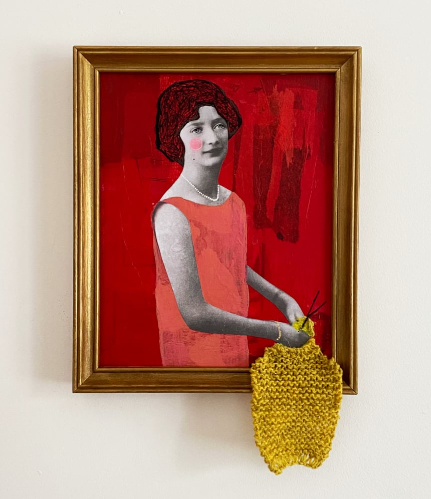 • Medium: paper collage, acrylic, drawing, and wool on canvas, set in an antique frame